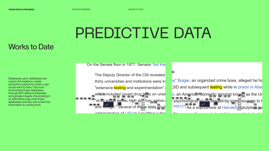 Lastly, even if conceptually I still have a lot to work towards, the project ideas I mentioned do exist and remain an actionable component I can work on. For example, something I can immediately work on from the presentation I briefly talked about is this system I made in Touch Designer that pulls from Wikipedia's API in order to visualize in some way the insurmountable data that AI models pull from all corners of the internet. My initial idea to expand on it is to create a database of words separated by their type of speech / sentence structure (i.e. separated by noun, verbs, adjectives, etc.), then have a text to speech model randomly ping out words in a common sentence structure. The goal in something like this is to visualize the process of an AI deliberating on how to come up with a sentence in a typical chat interface, and how this can lead to hallucinations or misinformation. The "sentences" it makes are structured right and contain the right words, but the context is absent and construed, and the meaning is obscured or non-existent from a human angle.