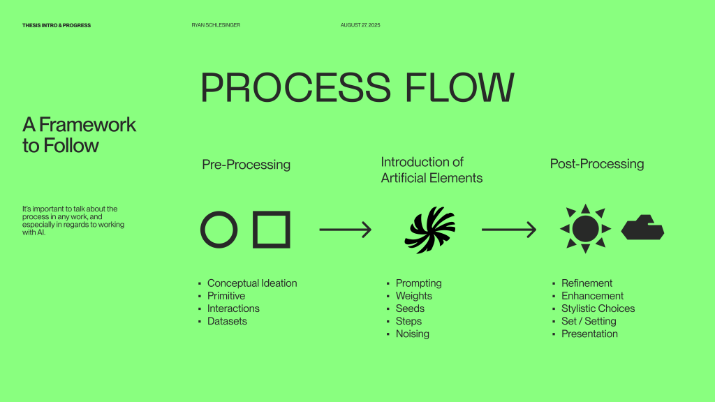 There were some good things, however. The process framework is a valuable asset to have in the time to come for the development of some of the bigger ideas I need to have. Putting a process down like this is a good way to organize thoughts on a project level, and a source of organization/deliberation to come back to as things progress. As with most other aspects of my thesis at this point it will need refinement in its presentation and applicability. It is also a source of accessibility too. If I were to conduct a workshop that goes through a creative workflow with AI, even a high-level process like this could open new ideas and avenues for exploration from participants.