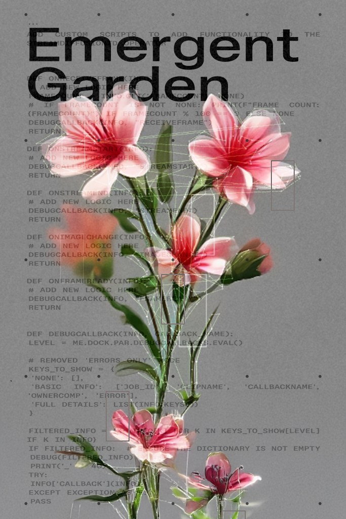 The Emergent Garden speculates a space of care and curiosity. AI’s constant retooling and reprompting reveal an evolution of images in real time. The poster envisions a garden that algorithmically grows unique fauna, never quite the same, offering a shared experience that reminds us of our role as co-creators and caretakers of technologies, ecosystems, and each other.