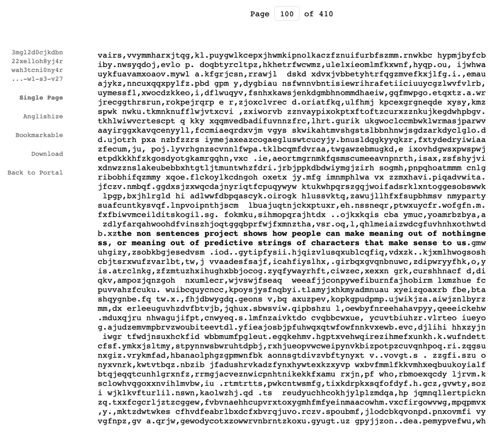 I think the printer adds a lot. As I said in a previous post it adds a more tangent physical aspect to the digital words that are output by this LLM, and with the huge line that I already managed to print that reached my floor from my apartments counter, I can see the vision of it piling up a lot more over time. As far as the words on the paper itself, in the instance I was running it the sentences were backing up on themselves a little bit, with words and characters being a little re-arranged in just a bit more of a non-sense random way. I think this can unintentionally add a bit to the "Non-Sense" idea of the record keeping of these AI outputs, where the sense it makes becomes even more diluted, with even smaller strings of a couple words making sense. Overtime this adds up to this wall of text with no meaning besides what we make, akin to a never-ending chat with an LLM that can keep going forever and ever, losing that meaning over time. Visually, this also connects to the image/latent space ideas I brought up earlier this semester. A comparable visual is the "library of babel", which is a thought experiment / actual website comprised of theoretically every piece of text that can ever and will ever be written. Of course, most of it is nonsense characters in chapters of books of meaningless-ness, but technically everything is in there, from the cure to cancer to the exact details of the day you die, to my entire written portion of my thesis, already written for me. Think infinite monkey's on infinite typewriters across all of time and space. In a way, "Non-Sentences" is a physical slice of the library, one that I am really satisfied with how it has progressed.